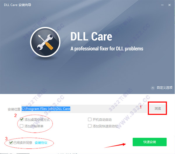 1.下載好數(shù)據(jù)包后,直接解壓用鼠標雙擊“DLLCare_Setup.exe”打開進入安裝向?qū)?,點擊“瀏覽”可隨意更改安裝目錄,默認路徑為“C:\Program Files (x86)\DLL Care”。然后在在創(chuàng)建桌面快捷方式前面勾上,在勾選同意相關協(xié)議,最后點擊“快速安裝”