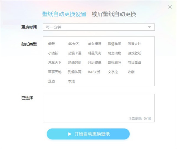 1、動態(tài)壁紙 讓桌面動起來 動態(tài)壁紙,開啟全新動態(tài)沉浸式體驗! 2、拉一下 換壁紙 拉一下?lián)Q壁紙,讓桌面美化變得更加輕松有趣! 3、高清美圖自動換 一鍵開啟自動換壁紙功能,您無需指定圖片,只需要指定您喜歡的圖片分類,并且在指定的時間間隔內,自動為您更換壁紙,讓您的桌面天天都有新的氣息! 4、壁紙收藏 選擇你喜歡 我的收藏我做主,一鍵收藏喜歡的壁紙,支持自動隨心換,讓您每天換出好心情! 5、十大分類隨心選 十大分類:美女、風景、小清新、動漫、明星、愛情、萌寵、影視、汽車,海量壁紙任你選擇,分類更詳細,內容更豐富,時時為您添加最新的壁紙,讓您的電腦天天都有新的表情。