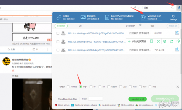 3、接著打開一個網(wǎng)頁點擊 GetThemAll Video Downloader 選擇video/flash ,我們就會看到如下圖,視頻的網(wǎng)址、來源、大小等會依次展示,這里我們選擇格式MP4然后可以開始下載自己想要的視頻了。當然這里還有flv、avi、3gp、wav、mid等多種音頻格式,大家可根據(jù)自己的需要挑選。