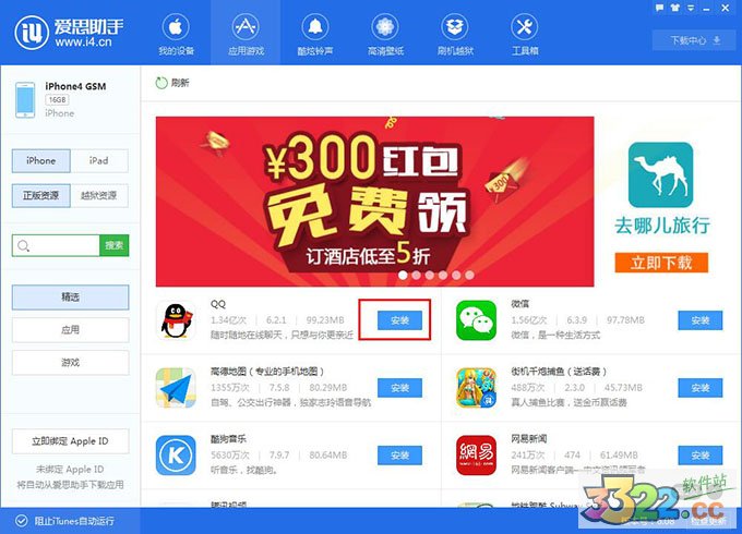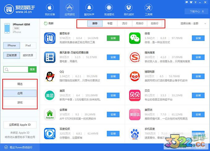 2.在愛(ài)思助手PC版 V6中,我們給大家分了三大類,您可以直接搜索下載您想要的 APP應(yīng)用,也可以進(jìn)入我們的分類去選擇你喜歡的應(yīng)用;此外,“應(yīng)用“和”“游戲”里,我們另外又劃分出了推薦、專題、流行、月排行、總排行等,讓你一目了然小伙伴們都愛(ài)玩什么;