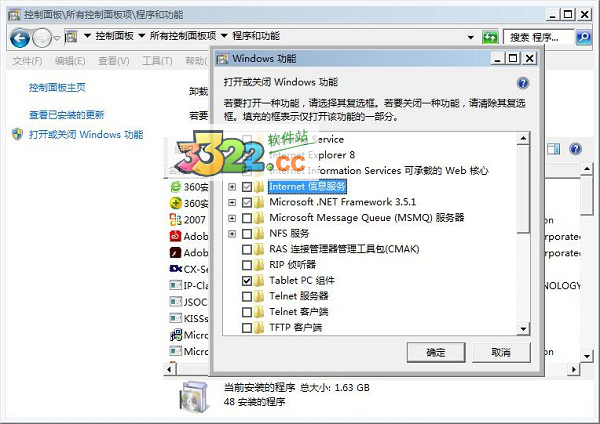 2、安裝消息列隊(duì)和網(wǎng)絡(luò)服務(wù)(打開“控制面板—程序卸載—打開或關(guān)閉window功能”)在彈出的界面中勾選“internet信息服務(wù)”和“MSMQ服務(wù)器”然后點(diǎn)擊“確定”退出