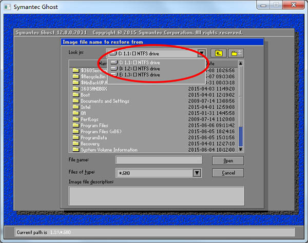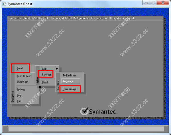 2、按圖示方法選擇,可以直接記憶成“123”,第一步選擇“local”,也就是第一個(gè);第二步選擇“Partition”,第二個(gè);第三步選擇“From Image”,也就是選擇系統(tǒng)所在盤符,第三個(gè)