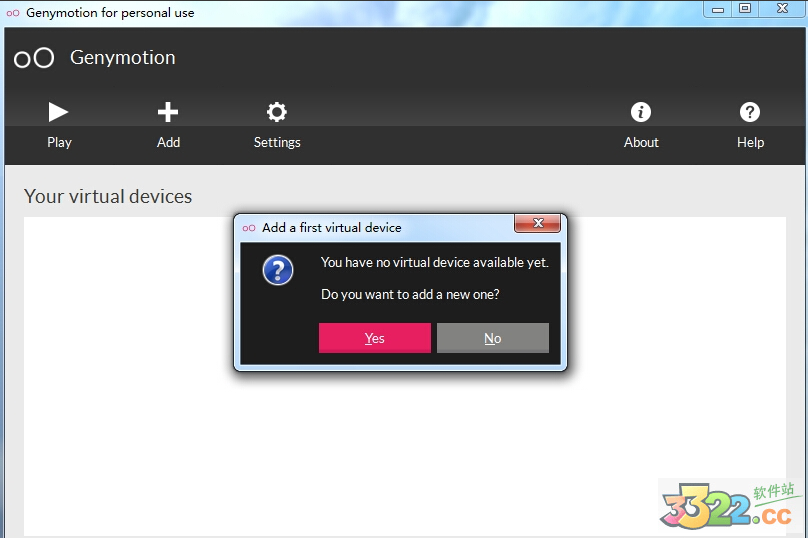 1.第一次打開軟件會(huì)檢查你是否有安卓虛擬設(shè)備,如果沒有會(huì)彈出對(duì)話框,問你是否現(xiàn)在添加一個(gè)虛擬設(shè)備,點(diǎn)擊“yes”。