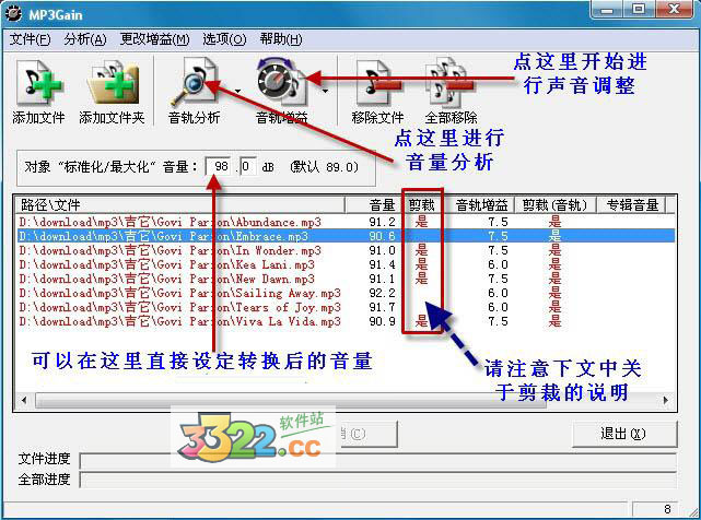 第三步:點音軌分析按鈕。MP3Gain能夠分析文件并報告當前音量水平,并參照對象“標準化/最大化”音量。記錄mp3的原始音量(在音量列中),如果你想修改音量設置,你可以回到它的原始音量。