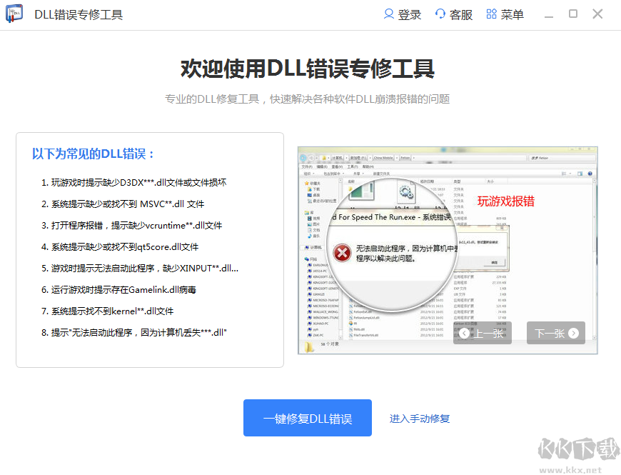 《DLL文件修復工具》是一款專業(yè)的DLL文件缺失及錯誤的修復工具,使用DLL文件修復工具可以一鍵掃描系統(tǒng)缺失DLL文件,并一鍵修復,使用簡單快捷,高效修復,系統(tǒng)運行穩(wěn)定正常!有需要的朋友不要錯過,KK下載站推薦大家下載體驗!