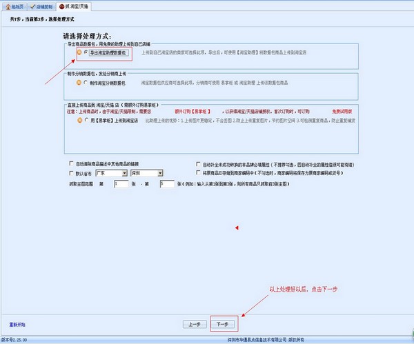 6、選擇處理方式,每個處理方式后面都有相關(guān)文字的介紹,請詳細(xì)瀏覽。下面以導(dǎo)出淘寶助理數(shù)據(jù)包為教程: