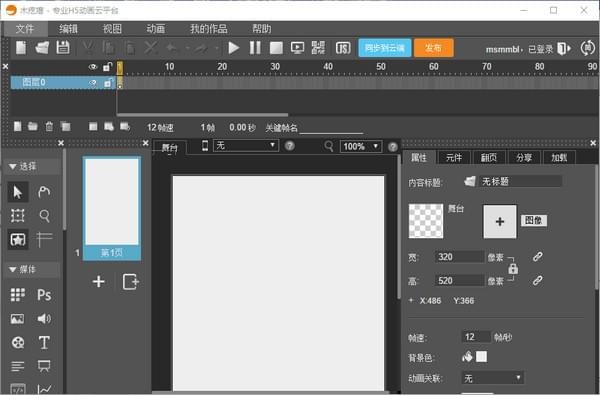 起動MugedaApp后將全自動建立一個空缺的新作品。除此之外,和線上版的Mugeda一樣,能夠根據(jù)萊單中的“新創(chuàng)建”選擇項,或菜單欄上的“新創(chuàng)建”按鍵建立新的作品。