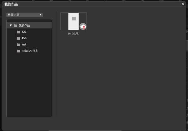 點一下工具欄中的“開啟”或菜單欄中的“開啟”標志,就可以開啟“我的作品”提示框。提示框左上方出示了“線下內(nèi)容”和“線上內(nèi)容”的挑選下拉列表。“線下內(nèi)容”儲存了在該設備線下MugedaApp中建立、編寫后儲存的內(nèi)容。如果是連接網(wǎng)絡情況,“線上內(nèi)容”顯示信息了在云端儲存的全部內(nèi)容。