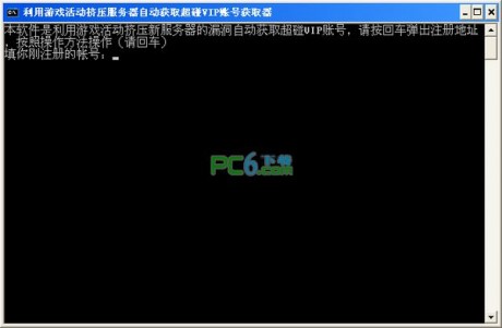 第四步:返回軟件 輸入你剛才注冊(cè)游戲的會(huì)員名稱后回車, 填寫你剛才注冊(cè)游戲網(wǎng)的密碼后按回車。 填寫你要接收超碰VIP賬號(hào)的郵箱 按回車。 信息提交成功,按回車確認(rèn)
