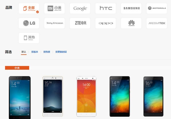 3、然后選擇“小米”-“小米4”進(jìn)入小米4手機(jī)ROM刷機(jī)包下載界面。從中就可以找到針對小米4的Win10預(yù)覽版系統(tǒng)。