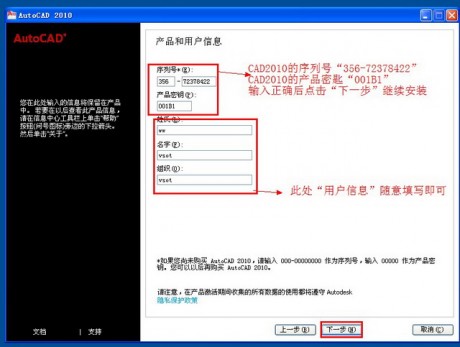 用戶信息自己隨意填寫即可 CAD2010 32位中文版序列號“356-72378422” CAD2010 32位中文版產(chǎn)品密匙“001B1” 輸入無誤后點擊“下一步” 如圖六。