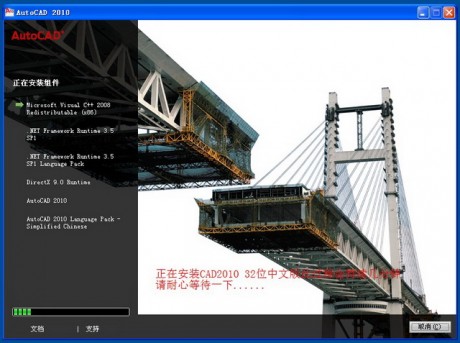 正在安裝CAD2010 32位中文版 此過程會持續(xù)幾分鐘 請耐心等待一下...... 如圖八。