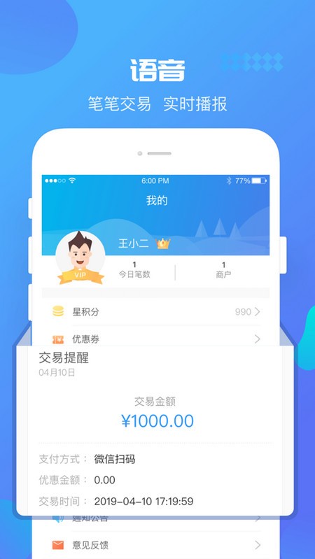 隨時(shí)都可以開啟語音播報(bào)功能,收款交易成功后自動語音播報(bào);