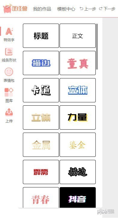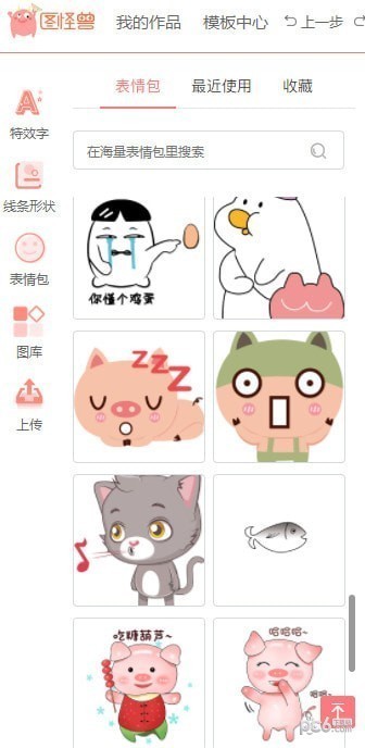 文字更換完畢后又可以在左側(cè)增加特效字、線條形狀和表情包等操作;如果自己有本地的圖片也可以通過上傳來對圖片進行相對應(yīng)的設(shè)計;