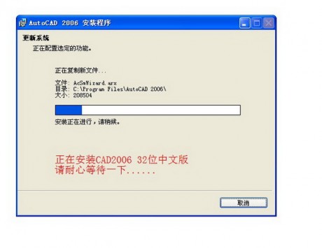 正在安裝CAD2006 32位中文版 此過程會持續(xù)幾分鐘 請耐心等待一下......,如上圖所示: