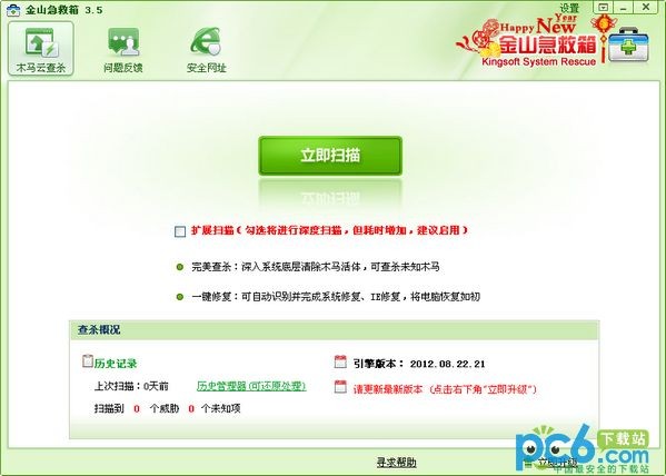 金山系統(tǒng)急救箱為電腦用戶(hù)提供了最佳的殺毒方案,如果你中了頑固病毒木馬,殺毒軟件無(wú)法清除,甚至殺毒軟件都無(wú)法啟動(dòng)的話,那么金山急救箱絕對(duì)可以幫助你解決!它可以更深的掃描你的系統(tǒng),找到隱藏在底層的病毒,強(qiáng)力查殺頑固和未知木馬。并能將系統(tǒng)和上網(wǎng)環(huán)境恢復(fù)如初。金山急救箱采用全新的云安全技術(shù),不會(huì)與任何殺毒軟件沖突,是裝機(jī)的必備安全軟件。
