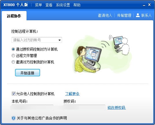 XT800遠程控制軟件是一款能夠穿透防火墻的遠程控制軟件,使用簡單方便,和其他遠控工具一樣,只要在兩臺電腦上都安裝這款軟件,然后控制端輸入被控制端的號碼和授權(quán)碼點擊【開始連接】按鈕就可以進行遠程連接了!