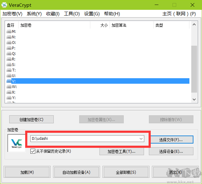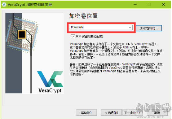 5.選擇加密卷位置,這里找盤符,創(chuàng)建文件,名字隨意寫,小編以創(chuàng)建到d盤為例,選擇創(chuàng)建udashi加密文件。