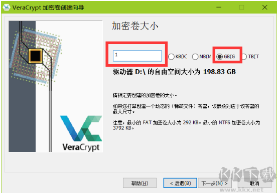 6.后面的而下一步下一步,就選擇空間大小,一般情況下看我們有多少東西是需要加密的,按照實際情況選擇,這里小編選擇1G。