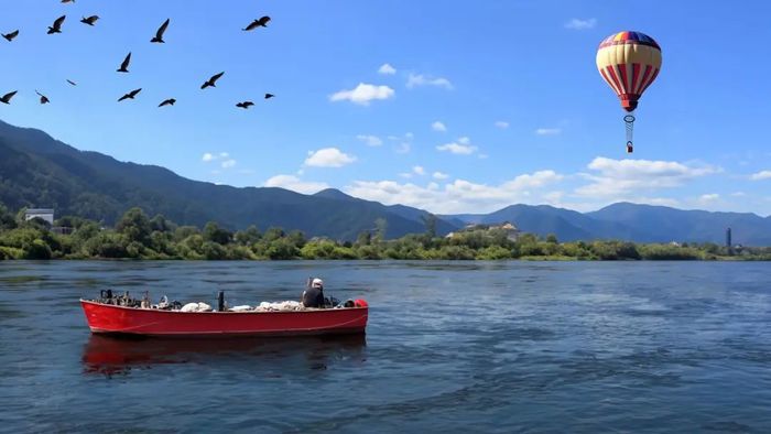天上有些空?只需在天上掛一個熱氣球(a hot air balloon)、幾只飛鳥(A flock of birds)。三句話,讓 Photoshop 幫我畫一幅春江垂釣風景圖。