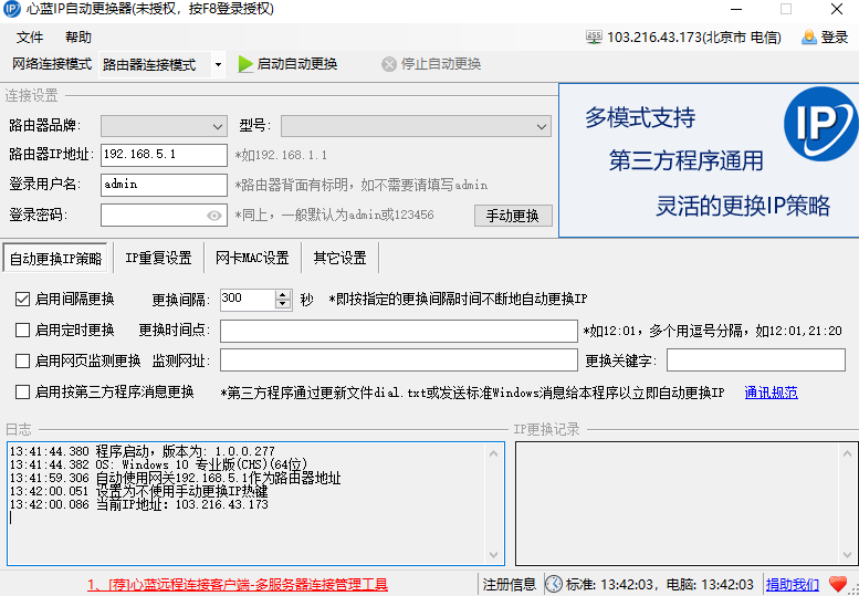 3、支持常見(jiàn)的寬帶和路由器連接模式的自動(dòng)更換IP;