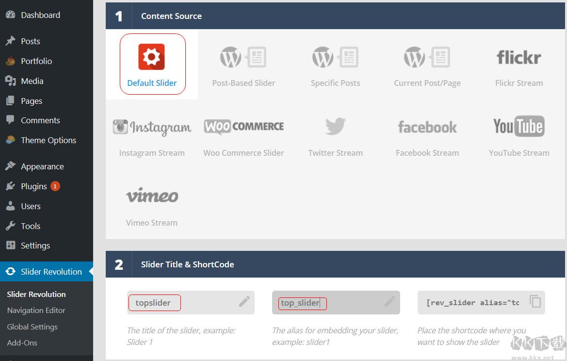 在wordpress后臺,點擊“slider revolution”,然后點擊“New slider”。
