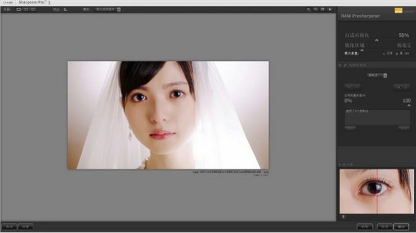 2、第二個(gè)滑塊為銳化區(qū)域和銳化邊緣,顧名思義,往左滑動(dòng)是對(duì)畫(huà)面的大塊區(qū)域進(jìn)行銳化,比如圖中的臉,而向右滑則是對(duì)畫(huà)面邊緣的部分進(jìn)行銳化,比如圖中婚紗的外輪廓。