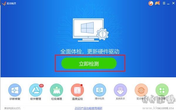 2、運(yùn)行軟件,進(jìn)入軟件的主界面,點(diǎn)擊軟件界面中間的立即檢測(cè)選項(xiàng),如圖紅框顯示:
