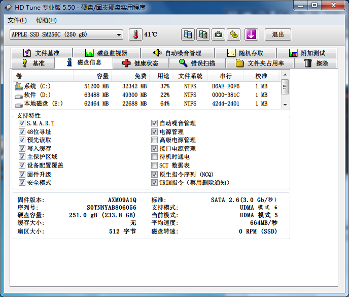 磁盤信息可以看到我們使用的硬盤序列號,硬盤容量、硬盤速度、硬盤轉(zhuǎn)速、固件版本等信息