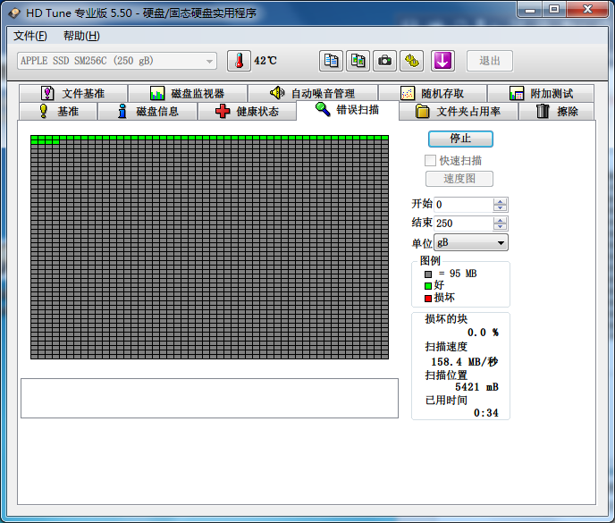 錯誤掃描能夠掃描出硬盤的錯誤,包括邏輯壞道,正常情況下掃描是綠色塊狀,如果是紅色表示硬盤有壞道: