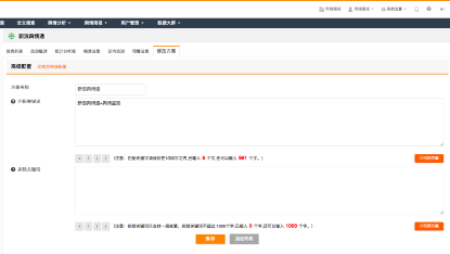 在彈出的頁面“新增方案”中,選擇“快速配置”或“高級(jí)配置”(“快速配置”適合初級(jí)用戶,“高級(jí)配置”適合高級(jí)用戶)。其中,本處選擇高級(jí)配置,設(shè)置方案名稱為“新浪輿情通”,匹配關(guān)鍵詞為“新浪輿情通+輿情監(jiān)測(cè)”,點(diǎn)擊保存。