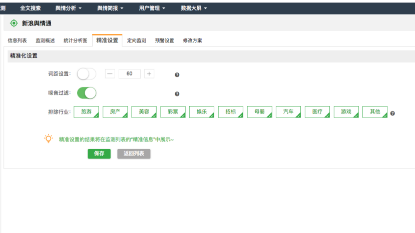 如果你發(fā)現(xiàn)信息列表所展示的信息不符合預(yù)期,則應(yīng)當(dāng)對(duì)監(jiān)測(cè)方案進(jìn)行修改,比如添加匹配關(guān)鍵詞或者排除相關(guān)關(guān)鍵詞。除此之外,你還可以點(diǎn)擊精準(zhǔn)設(shè)置,用設(shè)置詞距、噪音過濾、排除行業(yè)等方式進(jìn)行更為精準(zhǔn)的設(shè)置。