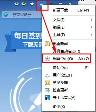 1、打開迅雷軟件,選擇右上角“菜單”選項,在下拉菜單中選擇“配置中心”。
