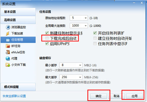 2、在打開窗口中選擇“高級設(shè)置”,然后選擇“任務(wù)管理”,找到“下載完成后自動關(guān)機(jī)”并在前面打勾,然后點擊確定應(yīng)用按鈕就可以了。