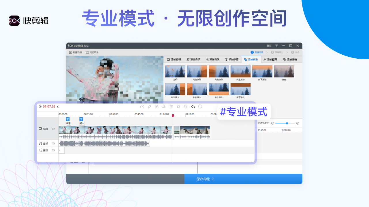 快剪輯對于視頻剪輯制作并沒有太多的專業(yè)技能要求,所以大大降低了視頻剪輯的門檻,即便是新手用戶也能一用就會!雖然門檻低,但功能卻一個不落,剪輯精確到幀,支持畫面分割、混剪等,為你打造高效剪輯!