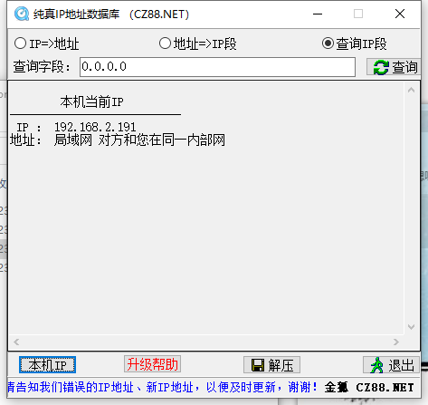 3、因?yàn)镮P地址數(shù)據(jù)是民間收集的,電信也會(huì)不時(shí)的更改IP段,所以有點(diǎn)遺漏、錯(cuò)誤是難免的。隨數(shù)據(jù)庫(kù)附送IP解壓,查詢軟件。