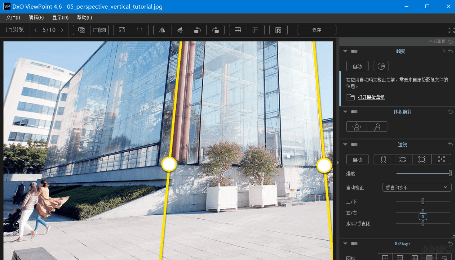 DxO ViewPoint 使用復雜的工具來編輯由您的鏡頭造成的各種扭曲的類型。無論是桶形畸變、pinc Muff 還是畸變的眼睛,圖像中不需要的曲線都不會受到影響,然后您可以輕松應用透視工具。