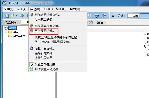 4.全方位掃描用戶電腦內存,即便是隱性問題也能輕易檢查出來。 制作內存檢測U盤方法: 1、下載Memtest86解壓之后會有一個ISO文件 2、然后準備一個U盤插入到電腦,打開UltraISO軟件,點擊啟動,然后寫入到硬盤映像; 4、然后選擇好U盤寫入即可; 5、插入U盤,開始U盤啟動啟動Memtest檢測內存。