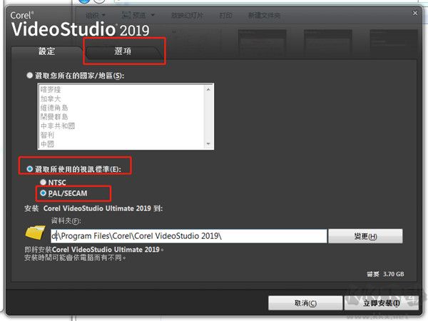 4:點擊“選取所有使用的視訊標(biāo)準(zhǔn)”,點擊“PAL/SECAM”。是否選擇跟換安裝位置,看自己個人習(xí)慣,直接安裝到默認(rèn)位置即可。選擇好之后,先不要點擊立即安裝,點擊“選項”。這里有個小暗艙需要注意一下。