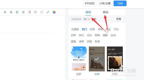 文章編輯完成后,點擊右側(cè)的模板與音樂,可插入相應(yīng)的模板以及音樂,選選中后即可預(yù)覽。