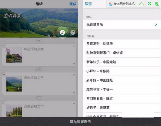5、點擊“音符”圖標,可以給文章設(shè)置一首背景音樂。因為在上班、深夜等情況下突然放出聲音比較嚇人,我們建議你謹慎添加音樂。