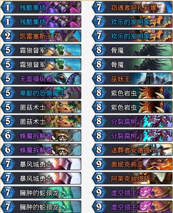 這套術(shù)士很簡(jiǎn)單,利用的就是戰(zhàn)吼和亡語(yǔ)兩個(gè)關(guān)鍵詞的隨從,這里不一一列舉作用了,相信仔細(xì)理解卡組的小伙伴都懂。起手我們優(yōu)先找能戰(zhàn)場(chǎng)的亡語(yǔ)隨從,其次再去找BUFF,瘋狂鋪場(chǎng)就好了,打盜賊稍微防一下刀扇,沒(méi)有手牌就抽。這里有好幾個(gè)隨從是橙卡,如果沒(méi)有的小伙伴可以替換成:夜刃刺客、袋鼠寶寶、退役冠軍等等有戰(zhàn)吼正面效果的隨從。最后,值得一提的是蛛魔我們?nèi)绻幸欢ㄒ獛?,我們本身是沒(méi)有法術(shù)的,那么可以卡主藍(lán)龍賊的節(jié)奏,藍(lán)龍賊清理場(chǎng)面是非常難的,蛛魔能為我們爭(zhēng)取1~2個(gè)回合就很不錯(cuò)了。