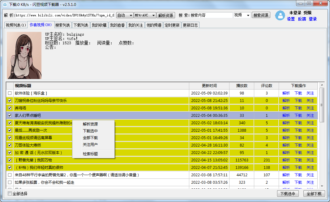 6、支持關(guān)聯(lián)UP主視頻,當(dāng)你解析一個(gè)視頻的時(shí)候軟件自動(dòng)查詢UP主其他視頻。