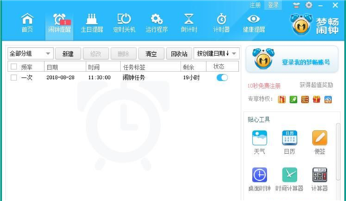 1、點(diǎn)擊夢(mèng)暢電腦鬧鐘主界面功能欄中的鬧鐘提醒,打開鬧鐘管理窗口;
