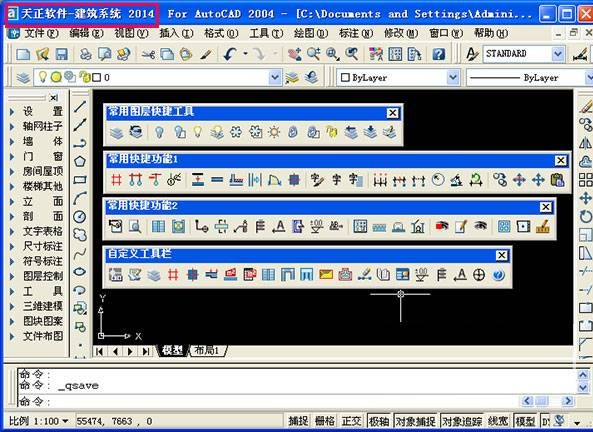 這里以天正建筑2014為例,其他版本的天正建筑操作一樣。可以看到,原始的界面顯示是這樣的,有眾多工具欄。