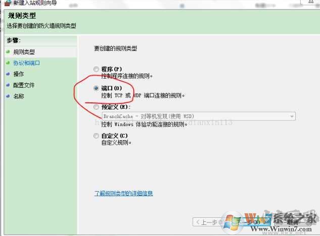 3、在要?jiǎng)?chuàng)建的規(guī)則中選擇“端口”。 點(diǎn)擊下一步。