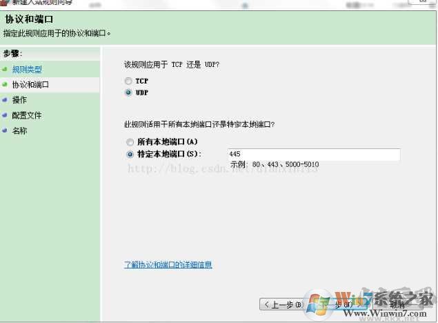 4、然后選擇UDP 再選擇特定本地端口,輸入要關(guān)閉的端口號(hào) 如 445 點(diǎn)擊下一步