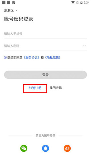 2、進(jìn)入登錄界面,點(diǎn)擊快速注冊(cè)(你可以選擇第三方登錄)