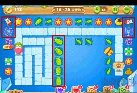 2、選擇升級的炮塔是很關(guān)鍵的,玩家在游戲的前期需要升級的有火箭炮和冰錐塔來保證小怪不會(huì)侵犯到蘿卜,同時(shí)為清除屏幕上的道具提供了保障。與此同時(shí)也要對中間的瓶子炮進(jìn)行升級,才能有足夠的火力去消除怪物;