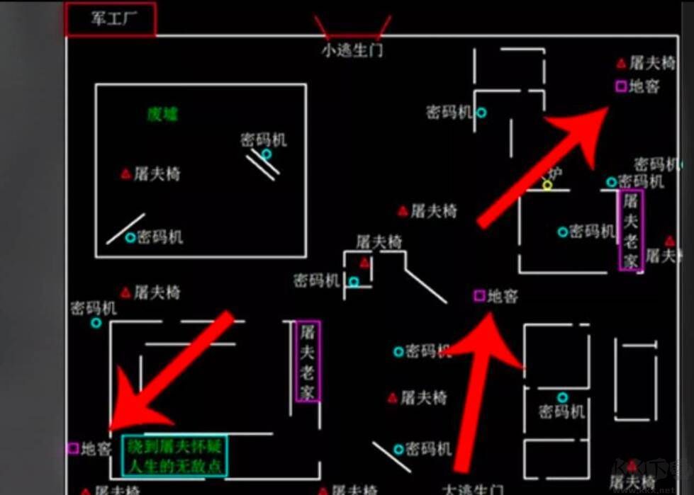 1,以軍工廠為例,這個(gè)地圖有三個(gè)地窖:一個(gè)在無敵房外圍,一個(gè)在小木屋前的兩個(gè)圍墻之間,一個(gè)在中場四合院附件。
